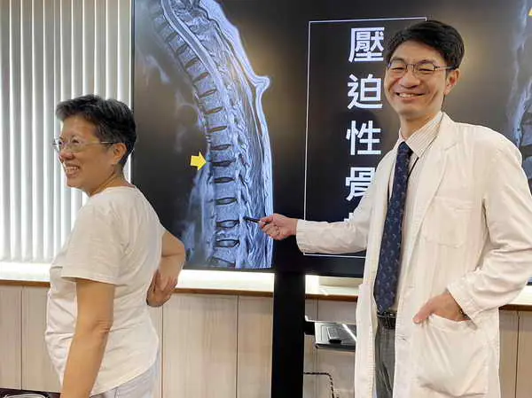 圖二:滕傑林主任(右)說明,宋女士的磁振造影可見脊椎多處壓迫性骨折,是多發性骨髓瘤的特徵。