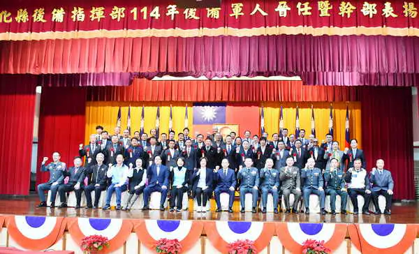【記者張德欽、吳三伯、温玉沛/彰化報導】彰化縣後備指揮部1月9日於社頭國立彰化特殊教育學校舉行114年後備軍人晉任暨幹部表揚活動,計授階56位晉任後備軍人並表揚176位後備幹部。王惠美縣長與會祝賀並表示,後備弟兄是國家社會安定的一股重要力量,藉此機會感謝所有後備弟兄的付出與貢獻。 王縣長表示,後備指揮部是地方非常重要的團隊,平時熱心公益,配合縣府協助地方庶務工作、支援救災等,在在都看得到後備弟兄的身影,特別國家的狀況更是有賴於平時做好相關準備,感謝大家為地方的服務。