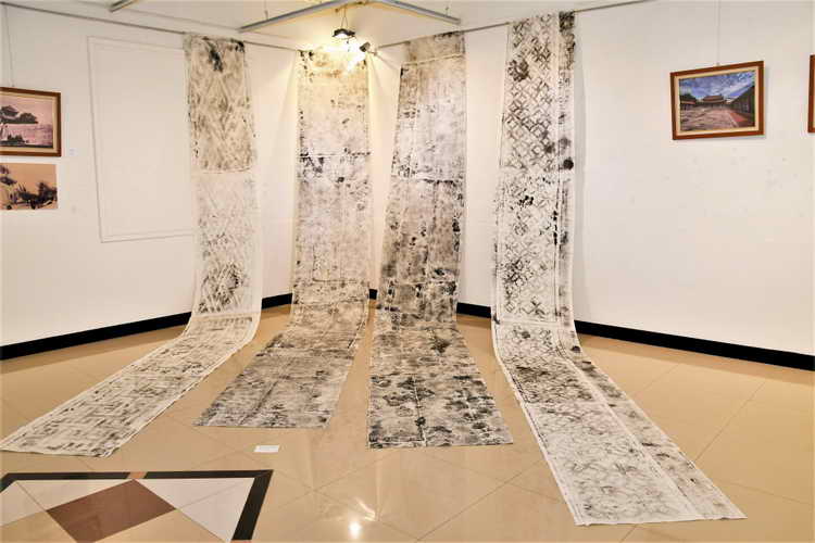 圖三:國定古蹟彰化孔子廟磚砌及縣定古蹟彰化慶安宮斑駁石板所拓印的古城印記。(記者温玉沛攝)