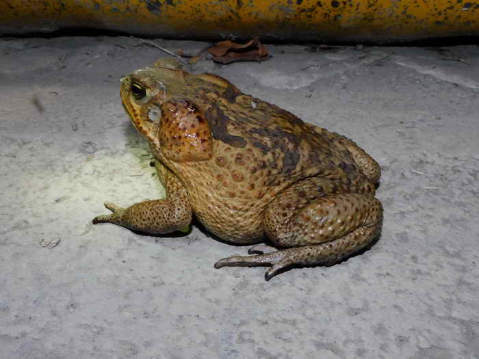 備註:海蟾蜍屬世界百大入侵種,體型大且具毒性,誤食會導致動物死亡,威脅生態及人畜安全,辨識特徵除了體型比原生種黑眶蟾蜍及盤古蟾蜍大上許多之外,耳後腺係呈三角型而非長條型,綠色虹膜也與黑眶蟾蜍的金黃色及盤古蟾蜍的紅色不同。
