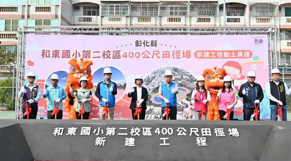【記者張德欽、吳黃玉女、温玉沛/彰化報導】為持續提升運動環境,彰化縣政府與和美鎮公所攜手於和東國小第二校區預定地規劃打造運動園區。3月19日上午舉辦400公尺田徑場動土典禮,彰化縣長王惠美、和美鎮長林庚壬及各級民代等人與會。王縣長表示,和美人口近9萬人,每到鎮運或大型運動賽事缺乏選拔體育選手的訓練場地以及廣闊便利的運動空間,因此與林庚壬鎮長共同規劃,感謝議長謝典霖與議員們的支持,以及地方代表的支持下,共同促成,期待未來讓運動選手就近就有優質運動訓練場地。