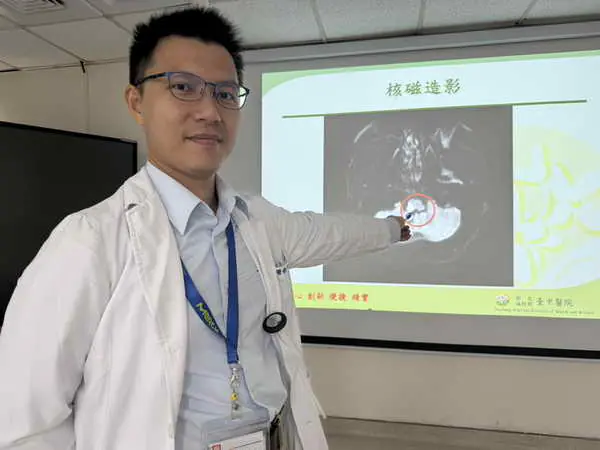 圖一:吳宇軒醫師指著患者核磁共振影像,說明患者腦幹右側血栓導致腦幹中風的位置。