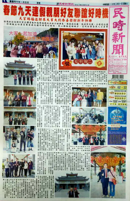 圖文:春節九天連假親朋好友聯誼好時機 天官賜福送財來大吉大利恭喜發財新年快樂,張德欽社長特別肯定讚賞敦和南勢福德祠洪源河理事長、蘇俊廷伉儷、張溪賓伉儷、王德寬伉儷、修緣觀主任委員簡榮梁伉儷所領導的團隊、用心積極造福地方,受到社會各界人士掌聲。