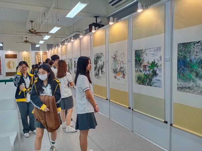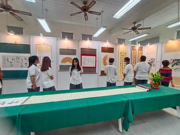 大里高中在張仲凱校長的積極爭取下,非常榮幸能搭上國立暨南大學「一堂無聲的人文素養課」這列藝術文化列車。展場布置溫馨典雅,更能襯托出作品的美感與質感。希望透過這班列車拉近與年輕學子的距離,啟發學生對藝術和文化的熱愛與探索。學生可以暫時逃離課本裡的知識,遁入「畫中有話」的水墨中,隨著墨色渲染而得到放鬆;國文課本裡的名言佳句,化為藝術作品,用無聲的方式呈現,提供不同的美感體驗。