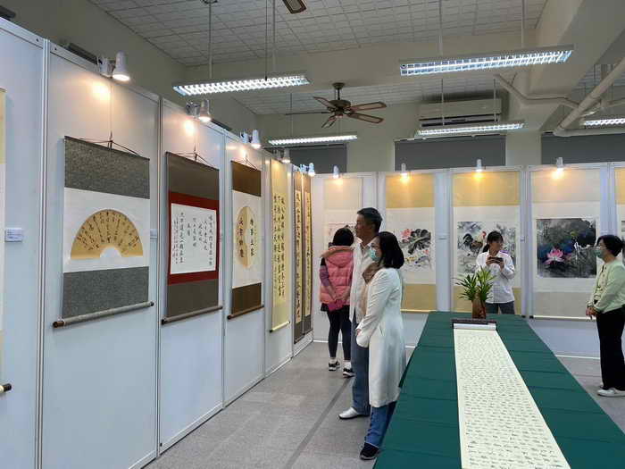 【記者張德欽、張珊瑜、張祐瑄、張耿慈、官庭瑪/中市報導】「國立暨南大學112學年度「文化列車:一堂無聲的人文素養課」書畫家林隆達、吳三賢、陳華聯合書畫展,3/4至3/8在臺中市立大里高中圖書館展出。展出作品共計四十二件,其中陳華的國畫展出分別有山水畫、花鳥畫、仕女圖等,主題有台中湖心亭、玉山主峰、阿里山、日月潭等本土地景。另外知名書畫名家林隆達、吳三賢書法作品,包含有展開數公尺的白居易的《琵琶行》、李白《早發白帝城》、王之渙《涼州詞》、蘇東坡的《定風波》等膾炙人口的詩詞及中外名言佳句。