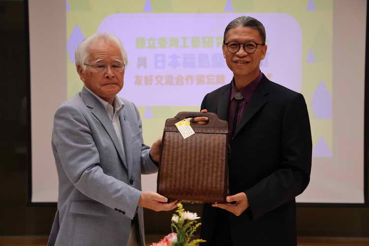 圖五:國立臺灣工藝研究發展中心透過簽屬雙方合作備忘錄與日本福島縣三島町持續工藝技術的交流,期待促進雙方地方工藝智慧的保存與工藝技術之發展,雙方彼此致贈禮品留念。