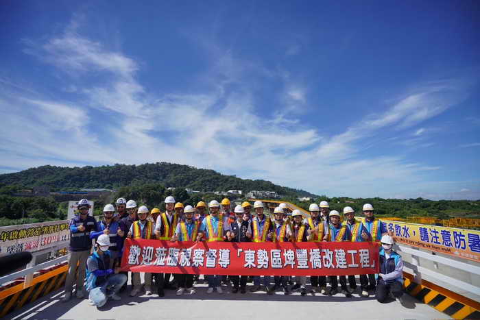陳局長進一步說明,埤豐橋是串聯東勢、豐原 、石岡、后里乃至苗栗縣的重要樞紐,所在位置上游就是石岡壩,921大地震時曾嚴重受損落橋,近年來更因大甲溪河道持續刷深,河道的改變,影響橋梁穩定與耐洪能力,過往的補強方式已不足以確保安全,不得不全面進行改建;橋面寬度特別再加寬到12公尺,除確保車行順暢外,兩側再增設人行道,並設置景觀區可欣賞夜景,加上夜間照明景觀設計,搭配遠處山巒及大甲溪的美景,相信未來將成為當地打卡新地標。