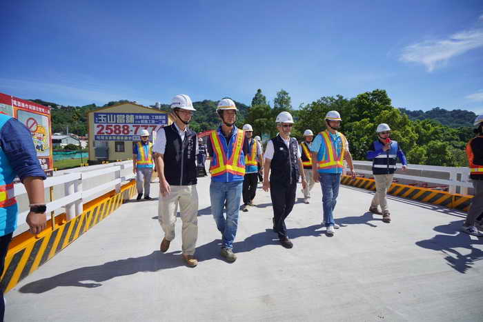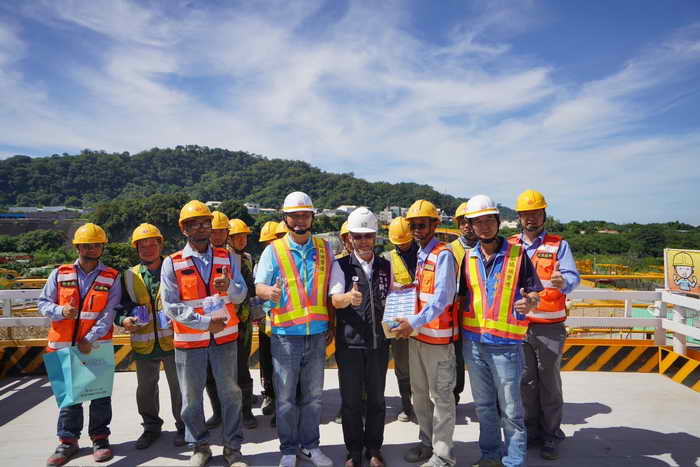 陳局長補充,今年陸續完成橋台及墩座的基樁與基礎施工,並完成橋梁第1單元的橋面吊裝作業,因臨水施工不易,且汛期易受風雨侵擾,除精進適宜的工序外,更增加高空作業施工架強度,提供安全作業環境。陳局長說,公共工程施工安全是市府建設團隊首重任務之一,除要求工程各分項計畫書務必詳盡並落實外,特別針對即將施工的帽梁、橋塔等結構及深槽區的吊裝作業,責成廠商應特別小心謹慎,確保人員施工安全周詳,並鼓勵承包商主動精進爭取獎項,朝如期如質於114年完工目標邁進。