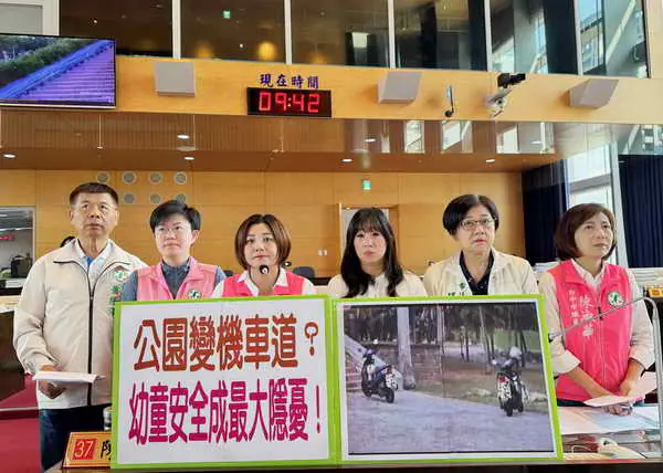 民進黨市議員陳雅惠、謝家宜、張芬郁、陳淑華、陳俞融、蕭隆澤24日在議會聯合質詢指出,東峰公園緊鄰東峰幼兒園,園方時常帶孩子上戶外課,市府卻放任機車穿越,明顯未落實管理責任。