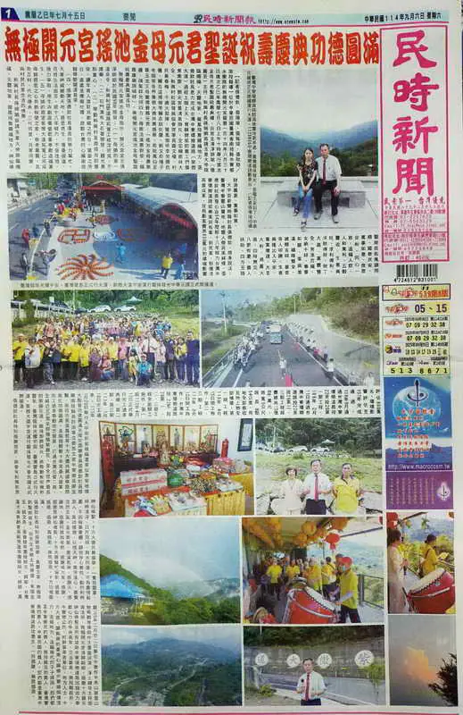 【記者張德欽、張珊瑜、張祐瑄、張耿慈/南投報導】位於中華民國臺灣省南投縣中寮鄉永樂路的無極開元宮國曆一百十四年八月三十日歲次乙巳年農曆七月八日上午十時舉行瑤池金母元君聖誕祝壽典禮,由宮主清淨師姐(簡麗芸)主持,和興村長孫瑞娟恭請玉皇大帝降臨賜福,天靈地氣、龍鳳飛舞賜福地方,張德欽社長愿力完成台灣中寮環鄉道路(紫微大道)過程上報上天、育靜師姐的義工們備煮素齋、開元宮黃清泉師兄、全宏精密林大全、和興村社區發展協會理事長羅文權、村民黃春梅、千歲大鼓陣、龍鳳咖啡李芳賜伉儷、賴在這裡咖啡賴志銘伉儷、劉文邦種子老師等各界善信大德共襄盛舉,恭祝萬仙至尊玉池王母寵徳碧霞元君:「瑤池金母壽無疆、瑞氣祥光照四方,母恩浩蕩惠群黎、福壽康寧錫禎祥」。無極開元宮瑤池金母聖誕祝壽慶典圓滿成功。