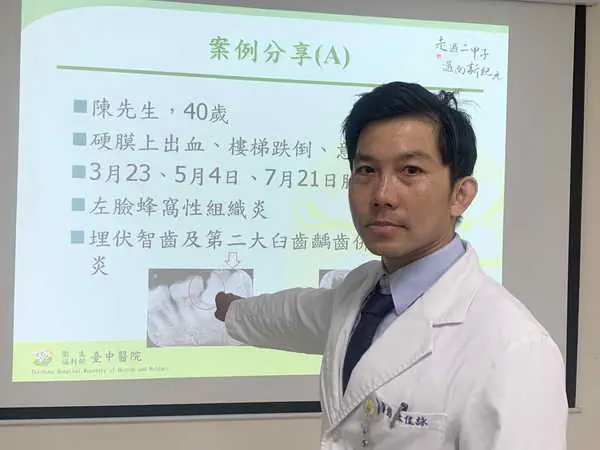 臺中醫院牙科主任林佳詠說,這名帥氣的業務員因為拚業績,今年2月跟客戶到KTV夜唱,酒後下樓梯不小心跌倒,撞傷頭部腦出血昏迷送醫,幸運搶回一命,但也從活躍的超級業務員變成臥床病人,住院治療期間,四個月內竟三度因為蛀牙導致蜂窩性組織炎,其中一次還併發肺炎命危。