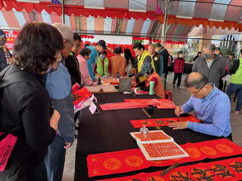 莊競程指出,現場有魚丸、爆米花、乳露蛋糕、落花生等台灣小吃,也有春聯、紅包袋,有吃又有拿,宛如提前過年,民眾都樂開懷。