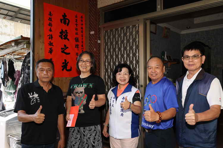 9日上午教育處副處長吳美玲、縣體育會總幹事洪銘惠、縣府體健科長蔡振發,先偕縣議員林婷立、仁愛鄉長江子信來到中正村卡度部落辜翠萍的姑姑辜淑惠家,在中正村長石金水鏗鏘有力的布農報戰功傳唱聲中,辜淑惠和先生石文吉驚喜的忙不迭地招呼訪客並協助張貼許縣長親賀的南投之光紅榜。