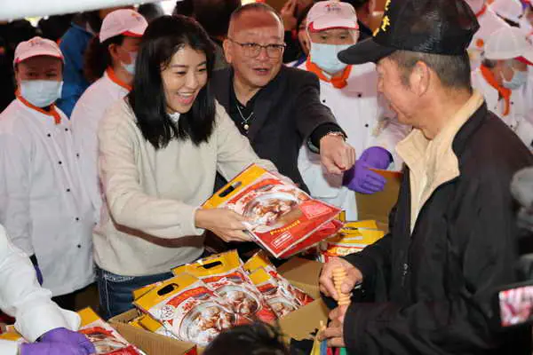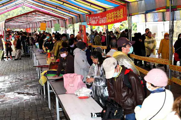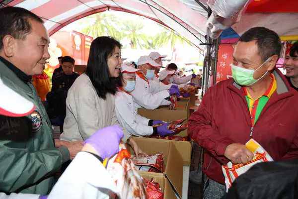 許縣長與莊主委連袂與分成許多組的工作人員,一起雙手忙不迭地分發丁酒料理包,工作人員和領受民眾施與受自然同現的臉上笑容相輝映,雖然人潮眾多,卻忙中有序一點也不雜不亂,溫馨場面似乎也趨走春雨的微寒。