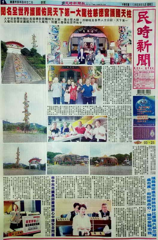 【記者張德欽、張耿慈\南投報導】天下第一大龍柱位於慈德宮南投縣草屯鎮南側的虎山頂上,據說慈德宮其建築有三奇。第一奇是外形如同一個臥倒的葫蘆,故有「葫蘆廟」之稱。 第二奇是廟口以四支龍柱橕起的斗笠形拜亭「天笠」。 第三奇則是高達三十公尺之護國天柱,高聳特立,屹立挺拔,高柱頂部還有一尊莊嚴的觀世音菩薩、是天下第一大龍柱,地靈人傑吸引神英堂整復中心賴梓芳大師、張士哲拍打大師、游柳枝大師等等人士前來做義工服務信衆、行功立德行菩薩道、大宇宙新聞時報社長張德欽、也是民時新聞社社長、中華民國資深記者協會常務監事、彰化縣新聞記者公會常務監事等各界人士均前往、慕名而來的信徒也不在少數。