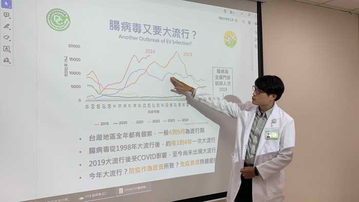 徐浩庭指出,腸病毒在台灣每3-4年大流行一次,2019年大流行後,因為新冠疫情防疫措施,一直沒有大流行,去年個案有明顯增加,但相較於2019還是比較少,而且曲線相對平緩,但今年從3月就開始增加,現在曲線持續上升,要提高警覺可能會有大流行