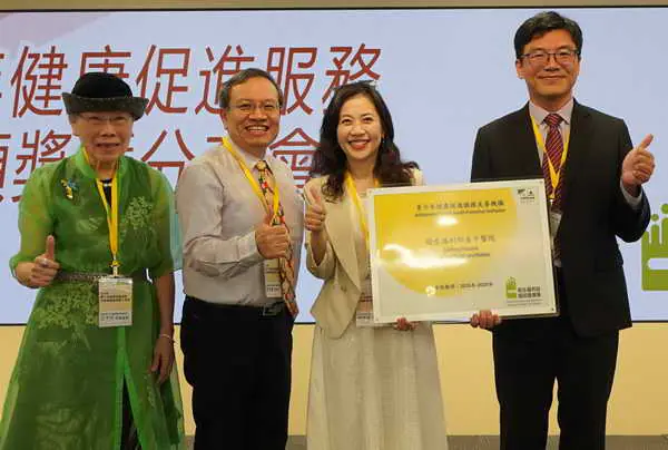 圖一:臺中醫院通過國健署頒發青少年健康促進聯盟友善機構認證,小兒科主任李德敏(右一)代表前往受頒證書。(臺中醫院提供)