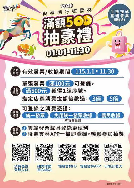 「2026 與神同行遊雲林滿額 500抽豪禮」活動自 115年1月1日起至11月30日止,民眾於雲林縣內單筆消費滿100元以上,憑發票或合法收據至活動網站註冊成為會員並完成登錄,累積消費滿500元即可獲得1組抽獎序號,消費越多、機會越多。相關活動資訊請持續關注「慢遊雲林」FB及活動官方網站(https://www.yunlinluckydraw.net/),掌握最新、最快的雲林活動訊息。
