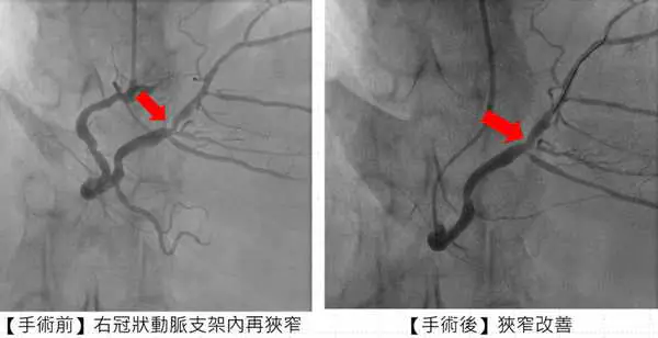 圖一:來自花蓮患者張先生施行「刀片氣球」及「塗藥氣球」治療後,右冠狀動脈支架狹窄改善。