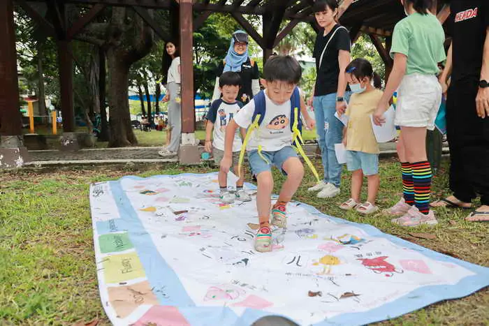 「寓教於樂」親子市集,有闖關攤位、有小小消防員體驗、還有摸彩等活動,特別是遊戲闖關,將學習元素融入遊戲中,達到寓教於樂目的。