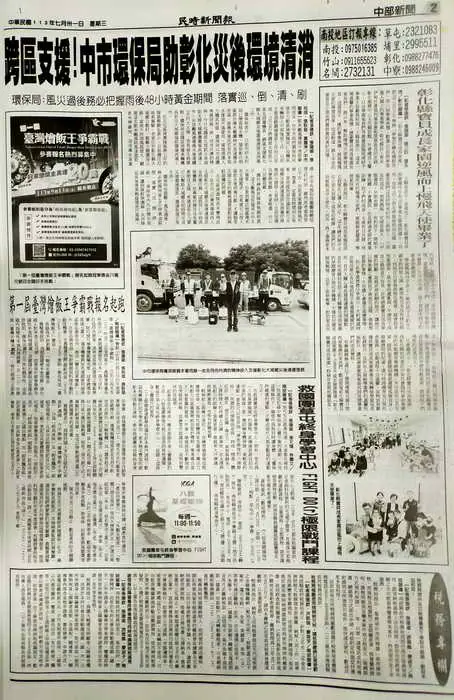 環保局表示,日前市府水利局已增派抽水機,協助彰化地區部分淹水鄉鎮抽水加速積水消退,因淹水後民宅有許多泡水傢俱不堪使用,當地清潔人力機具有限,環保局以市長盧秀燕同島一命、同舟共濟的精神,今日也調派大型抓斗車協助支援大城鄉廢棄家具清運工作;另因颱風過境淹水後連續2天的大太陽,容易滋生病媒蚊,環保局並調派消毒車輛機具前往大城鄉協助環境消毒工作。
