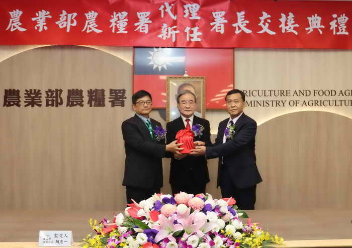 圖一:農業部農糧署7月3日上午舉行新任、代理署長交接,由該部胡忠一政次主持交接,姚士源成為新任署長。