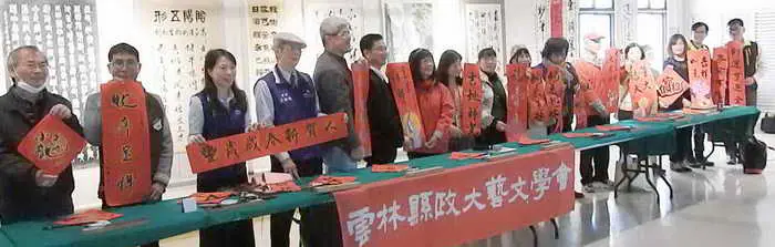當天會員展開幕活動在優雅國樂聲中,眾多來賓每人寫一字完成美輪美奐『金蛇年政大藝文學會作品展開幕』壯觀,各大師也獻出其書寫春聯作品合照後圓滿結束,使在場來賓觀眾心靈感受充實收穫良多不虛此行讚譽連連。斗六市公所辦理茂谷柑節在膨鼠公園第一天就有一萬五千人潮,該會排在11 日下午 第一場,另縣府文觀處迎春接力揮毫該會也排定1月18 日下午二時至四時三十分在古坑東和陳宅屆時歡迎鄉親前往賜教。