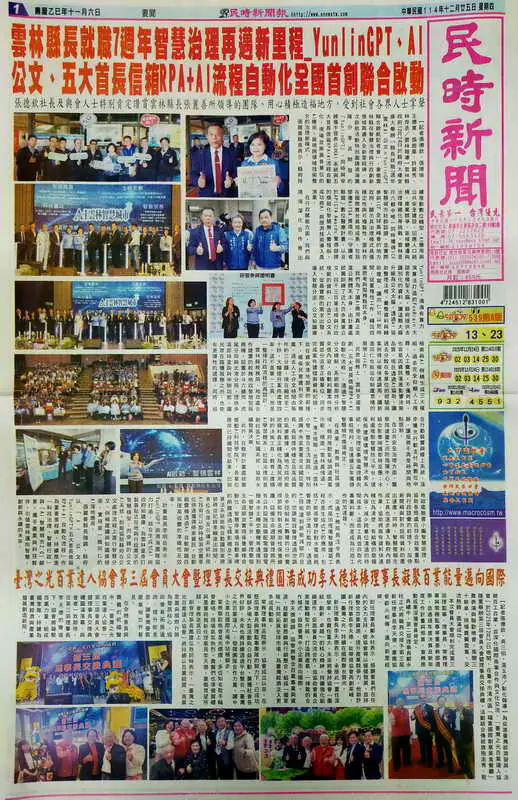 圖文:雲林縣長就職7週年智慧治理再邁新里程-YunlinGPT、AI公文、五大首長信箱RPA+AI流程自動化 全國首創聯合啟動,張德欽社長及與會人士特別肯定讚賞雲林縣長張麗善所領導的團隊、用心積極造福地方,受到社會各界人士掌聲。