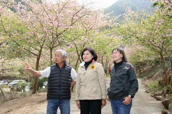 縣長與縣府團隊踏察與關懷今年櫻花季路況,並與當地居民及農場溝通,張縣長希望2024年櫻花季, 能夠為業者帶來遊客,交通能夠更順暢。首先第一站來到九芎神木、美人谷。建議遊客可以順道去五元二角、雲嶺之丘、杉林步道走走,享受天然芬多精森林療瘉。