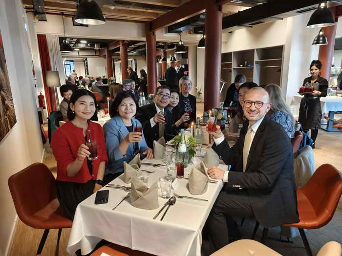 茶會後,兩縣團隊一同步行至Kulturmühle文化中心,並於Mahlwerk餐廳辦理歡迎晚宴,巴歆縣特別為張縣長團隊一行人準備道地德國風味餐、德國特產黑啤酒,張縣長及縣府團隊同仁均對於德國美食佳餚讚不絕口,也對巴歆縣的人文風俗留下深刻印象。此外,巴歆縣長Stefan Sternberg(史騰貝格)更特別準備雲林縣及巴歆縣締結姊妹縣25周年紀念蛋糕,還邀請25年前兩縣締結姊妹縣見證人巴歆市前市長Bernd Rolly一同歡慶,包含縣議會議長Olaf Steinberg、邦議會議員、縣議會議員眾人及禮賓處長Jana Haak等人也蒞臨參與,為兩縣間25年情誼留下感動的記憶。晚宴最終在巴歆縣為雲林縣府團隊準備戲劇「琴邊啤酒」中,為回訪巴歆縣首日行程劃下完美句點。