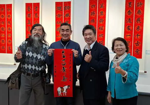 文化觀光處長謝明璇表示,昨天剛上任第一場參加藝文之展出,本展展出作品數量非常豐富,約有100餘件,除會員各有特色的書畫作品外,也集結「雲藝盃」全國春聯書法比賽各組別之獲獎作品,在一次展覽中呈現兩種風貌的作品;另外今年也搭配學會自辦「2026駿馬來舞春」現場揮毫活動,讓民眾得以由傳統藝術的角度切入,體會雲林傳統藝術的豐沛能量,更能現場領取免費春聯字畫,一同樂享春意盎然、喜氣滿盈的年節氣氛!歡迎雲林鄉親及喜好藝術的朋友們於展出期間一同來到文化觀光處展覽館,觀賞傳統書畫與春聯藝術之美的雙重饗宴。參與貴賓縣議員王又民受邀致詞談到其非常無奈之官司,縣議員顏忠義也受邀致詞首先恭喜文觀處長上任現場春滿大地喜氣洋洋受到冤枉終究神明會保佑平安,莿桐鄉長廖秋蓉也談到曾擔任過藝文學會理事長,公所書寫春聯還有待學會大師來協助。大家合影留念互祝馬上幸福身體健康闔家平安。