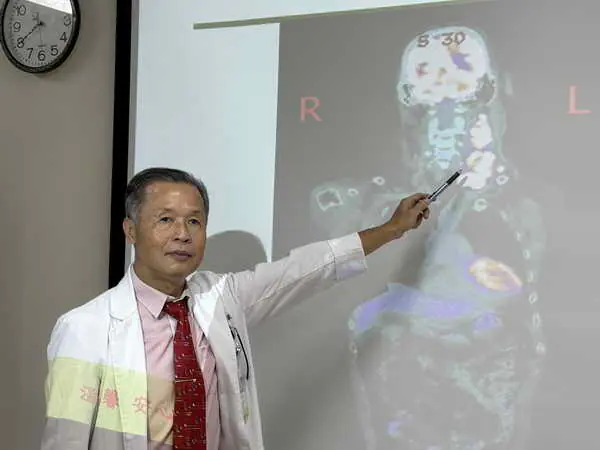 圖二:鄧政宗醫師說明患者正子攝影顯示,左頸有明顯長型巨大腫瘤,但其他身體部位未發現其他腫瘤。
