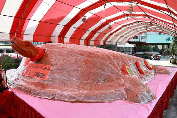開山廟主委陳孟良表示,每年農曆二月初一、二日兩天,廟方都會遵循古禮舉辦一系列慶典活動,開山公慶典最受矚目的是糯米大神龜,今年的大神龜得主邱玉英女士還願製作重達28,888斤大神龜,週五晚間將免費提供平安糯米龜供民眾享用。