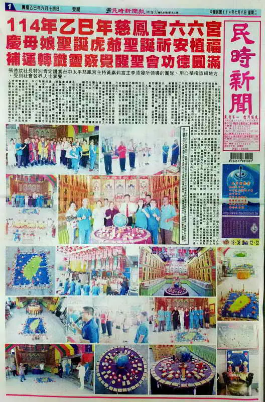 【記者張德欽、張珊瑜、張祐瑄、張耿慈、趙宏進/中市報導】114年乙巳年慈鳳宮舉行「六六宮慶母娘聖誕虎爺聖誕 祈安 植福 補運 轉識 靈竅 覺醒聖會」於農曆6月3日開香至6月8日功德圓滿,聖會由台中太平慈鳳宮主持黃素莉 宮主李添發 李偉旗 李偉鳴 李慈心 李添義及所有與會信衆、南投無極玄山宮佛祖殿、黃一壬 方崑河、大宇宙新聞時報社長張德欽也是民時新聞社長、中華民國資深記者協會常務監事、彰化縣新聞記者公會常務監事及各界電子、平面媒體記者與會共襄盛舉,114年乙巳年慈鳳宮六六宮慶母娘聖誕虎爺聖誕、祈安 植福 補運 轉識 靈竅 覺醒,聖會期間神跡無限、聖會功德圓滿。