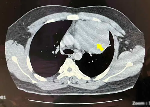 賴重佑部主任確認在前縱膈腔偏左,有一顆12公分且高度疑似為惡性的腫瘤。先安排患者入院檢查,包括做切片先確認腫瘤性質,接著進行胸部核磁共振造影以確定沒有侵犯心包膜,及腫瘤與心臟、肺臟的黏著程度。另外考量腫瘤疑似生殖細胞瘤,也做了腹部斷層掃描,確認肚子沒有其他腫瘤存在,在一連串深度檢查後確定是罕見的縱膈腔精細胞瘤。