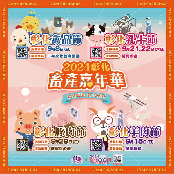 今年縣府結合雞、鴨、羊、豬、牛的主題辦理「2024彰化畜產嘉年華-智慧畜產.彰化優鮮」系列活動,希望透過活動推廣彰化的優質畜禽產品,同時也讓大家了解彰化農民對於畜產的用心經營與成效。另外,9月29日在田尾怡心園壓軸登場的是「彰化豚肉節」,歡迎全國民眾來同歡!優質畜產都在彰化「2024彰化畜產嘉年華」,智慧畜產逛不完。