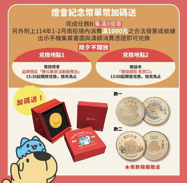 「集加買」換單幣,只要參加南投燈會的數位集章活動,集滿8點除了可獲得貓貓蟲咖波聯名紀念品。若加碼附上114年1-2月於南投境內消費滿1000元之合法發票或收據,可額外獲得「紀念幣單幣禮盒」款式隨機。