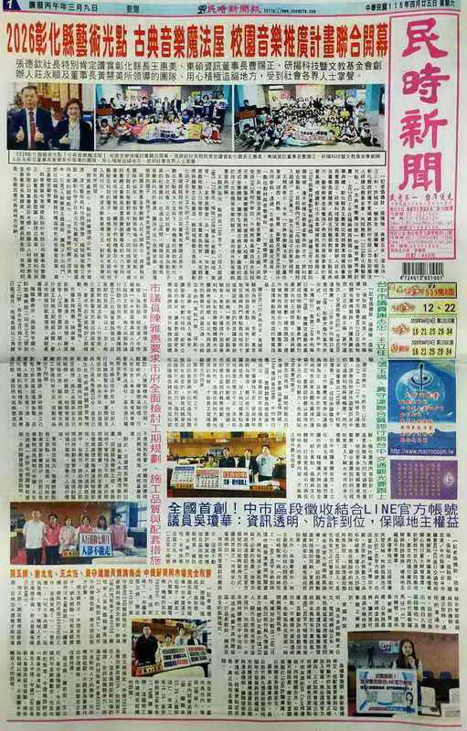 圖文:2026彰化縣藝術光點【古典音樂魔法屋】 校園音樂推廣計畫聯合開幕,張德欽社長特別肯定讚賞彰化縣長王惠美、東碩資訊董事長曹賜正、研揚科技暨文教基金會創辦人莊永順及董事長黃慧美所領導的團隊、用心積極造福地方,受到社會各界人士掌聲。