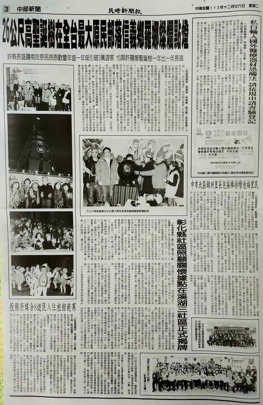 「信義鄉聖誕感恩活動」信義鄉公所循例在全台最大原鄉部落羅娜村盛大舉辦,全鄉部落族人都在熱烈歡慶迎接主耶穌基督誕生,家家戶戶擺設宴席款待,讓人感受聖誕佳節氛圍,晚會由鄉長全志堅主持,除了許縣長及縣府團隊,內政部長林右昌、原民會副主委谷縱‧喀勒芳安、立委孔文吉、伍麗華及鄉代會主席李國源等鄉代及各村長都到場。