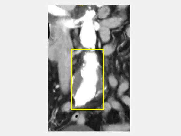 圖二:經檢查顯示腹部主動脈腫大(方框處),為腹部主動脈瘤。