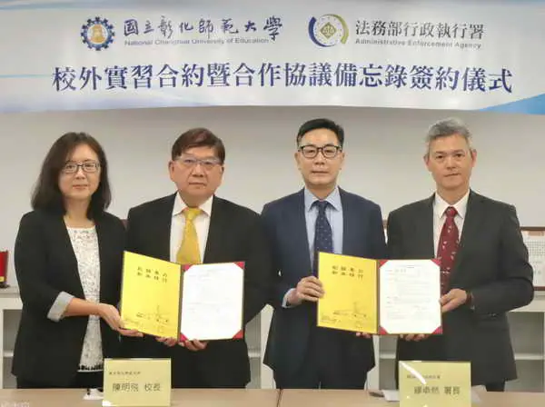 【記者張德欽、張珊瑜、吳黃玉女、溫玉沛、汪三和、許城誌、賴安全、張韡馨/彰化報導】法務部行政執行署為持續深化與高等教育之合作,在中部地區跨出跨領域合作的第一步,於115年3月31日與國立彰化師範大學舉行校外實習合約簽署儀式,由行政執行署繆卓然署長與彰師大陳明飛校長共同簽署實習合作合約,彰化分署分署長郭景銘並與公共事務與公民教育學系林玫君系主任簽訂合作備忘錄,本次活動特別安排於上午10時10分準時開始,寓意「十全十美、微笑曲線」,為整場儀式注入別具巧思的開場亮點,並象徵合作關係未來能走向盡善盡美。