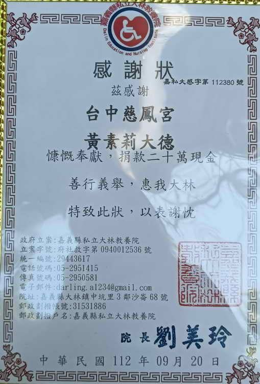 臺中太平慈鳳宮宮主李添發、主持黃素莉以「人飢己飢,人溺己溺」為弘揚「母娘慈悲」願心、示現行道,不僅將母娘慈悲濟世的精神深植人心,孝親、弘揚母德為宗旨,以主神母愛的宗教象徵,撫慰信仰者期望能發揮母娘慈悲的精神和護國佑民、閤境平安的目標。特別感謝感恩:與會有形無形衆神仙佛聖、十方大德共襄盛舉,【養我靈臺、時時清淨,日月同明、與水同清,不為塵情蔽塞、不因俗事牽纏,靜則存心養性、動而利物濟人,累功積德、以感天神,篤守道心、善養浩然正氣,金光紫氣、垂滿乾坤。感謝天、感謝地、感謝阿娘加老爸、感謝咱大家,感謝、感恩衆神仙佛聖、十方大德幫忙協助、感恩、感恩、感恩、再感恩、無限感恩,十方功德圓滿。