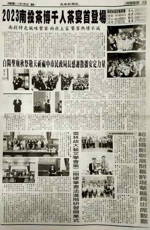 斗六南聖宮諮詢顧問蘇秋文致詞表示:陳泳全理事長也是該宮監事會監事, 平日很認真協助該宮環境綠美化之改善和維護,讓宮庭園景觀改變良多,更從旁協助宮推動相關文教活動,近期宮推展文教活動計有:雲林縣退休公教文化協會承辦書法班已開辦3期、國畫班研習巳歷2年、學童手提琴演奏研習班、學童舞蹈班研習,14日還與斗六就業服務中心在宮前辦理就業博覽會,10月22日(星期日),由中華玉線玄門真宗教會將在南聖宫,舉辦全台巡迴參鸞暨學術論壇活動,有來自全省各宗派宮廟的鸞筆及專家學者,在参鸞後共同把脈當前鸞堂困境,及如何精進鵉務為未來發展,相信這次活動必將盛况空前深具意義。