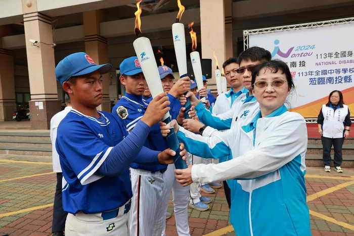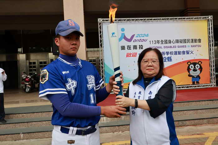儀式中,鄧副局長從聖火隊隊長手中接過聖火轉交本縣,由王處長代表接受,並轉交給南投縣聖火隊隊長,台北市聖火隊隊員也與本縣聖火隊的中興高中棒球隊員交接聖火,完成聖火交接,過程順利圓滿。林儒暘議員也手持聖火帶領南投聖火隊出發傳遞聖火,隨後再由台北聖火隊繼續傳遞到下一個縣市。